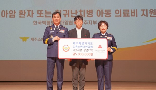 제주특별자치도의용소방대연합회(남성회장 최운철·여성회장 강정임)는 최근 제주학생문화원 대극장에서 제5주년 의용소방대의 날 기념행사를 개최하고, 지역사회 어려운 이웃을 돕기 위한 성금 500만원을 제주사회복지공동모금회(회장 강지언)에 기탁했다.
