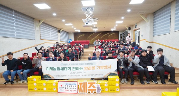 서귀포시4-H연합회(회장 오은규)와 서귀포산업과학고등학교 사회적협동조합은 최근 서귀포산업과학고등학교 대강당에서 제주사회복지공동모금회(회장 강지언)에 한라봉 4.5kg 50박스를 기탁했다.