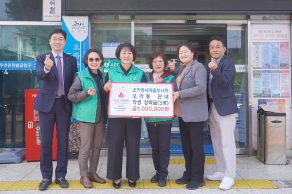 오라동새마을부녀회(회장 오명순)는 지난 26일 오라동주민센터(동장 강리선)에서 제주사회복지공동모금회(회장 강지언)를 통해 오라동 관내 학생들을 위한 장학금 100만 원을 기탁했다.
