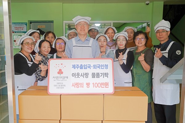 제주출입국·외국인청(청장 하용국)은 지난 27일 한라원(장애인 직업재활시설)을 방문해 제주사회복지공동모금회(회장 강지언)를 통해 직접 만든 빵 500개를 기탁했다.