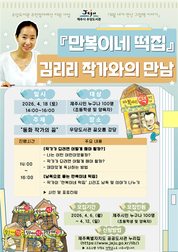 ‘동화 작가의 꿈’을 주제로 진행되는 이번 강연에서는 작가의 어린 시절 이야기와 등단 과정, 재미있게 독서하는 방법 등 다양한 이야기를 들려줄 예정이며, 강연 후에는 사인회도 함께 진행된다.