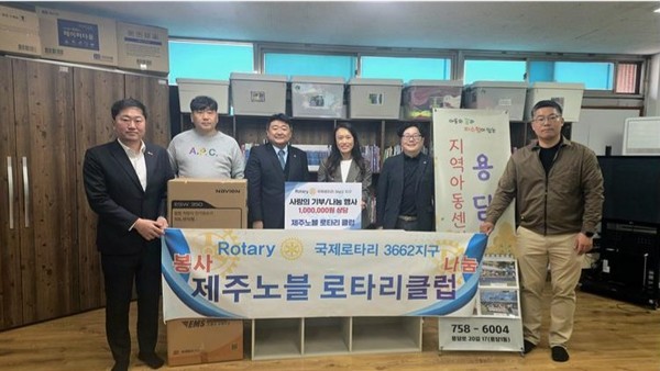 제주노블로타리클럽(회장 김기한)은 2026년 3월 27일 용담지역아동센터에 100만 원 상당의 물품을 지원하며 지역사회 나눔을 실천했다.