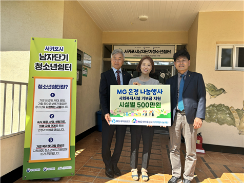 MG새마을금고중앙회 제주지역본부(본부장 서정도)와 하원본점(이사장 강의근)은 31일, 서귀포시남자단기청소년쉼터(소장 강성희)를 방문해 위기 청소년 지원을 위한 기부금 전달식을 가졌다.