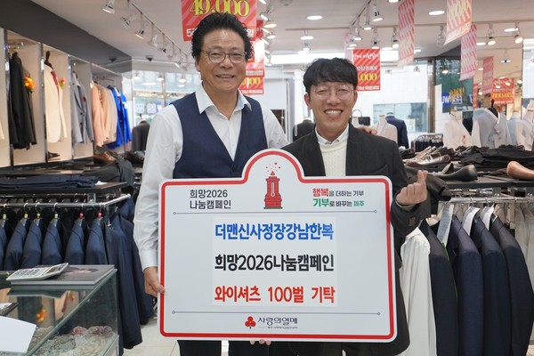 더맨신사정장강남한복(대표 김병채)은 지난 10일, 연말을 맞아 어려운 이웃을 돕기 위한 와이셔츠 100벌을 제주사회복지공동모금회에 기탁했다.