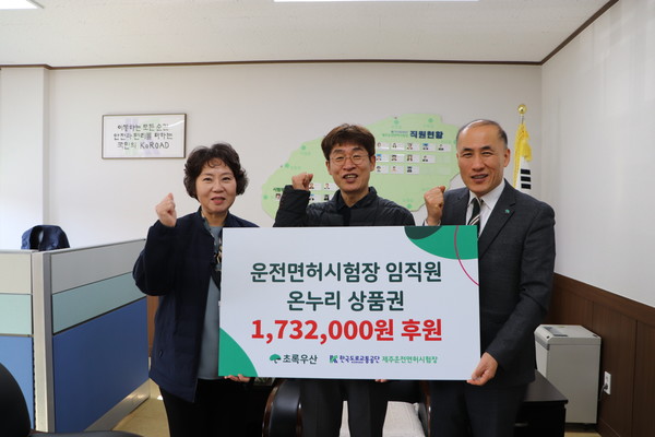 초록우산 제주지역본부(본부장 김희석)는 지난 29일, 한국도로교통공단 제주운전면허시험장(단장 황상섭)으로부터 연말을 맞이해 온누리상품권 및 후원금을 전달받았다.